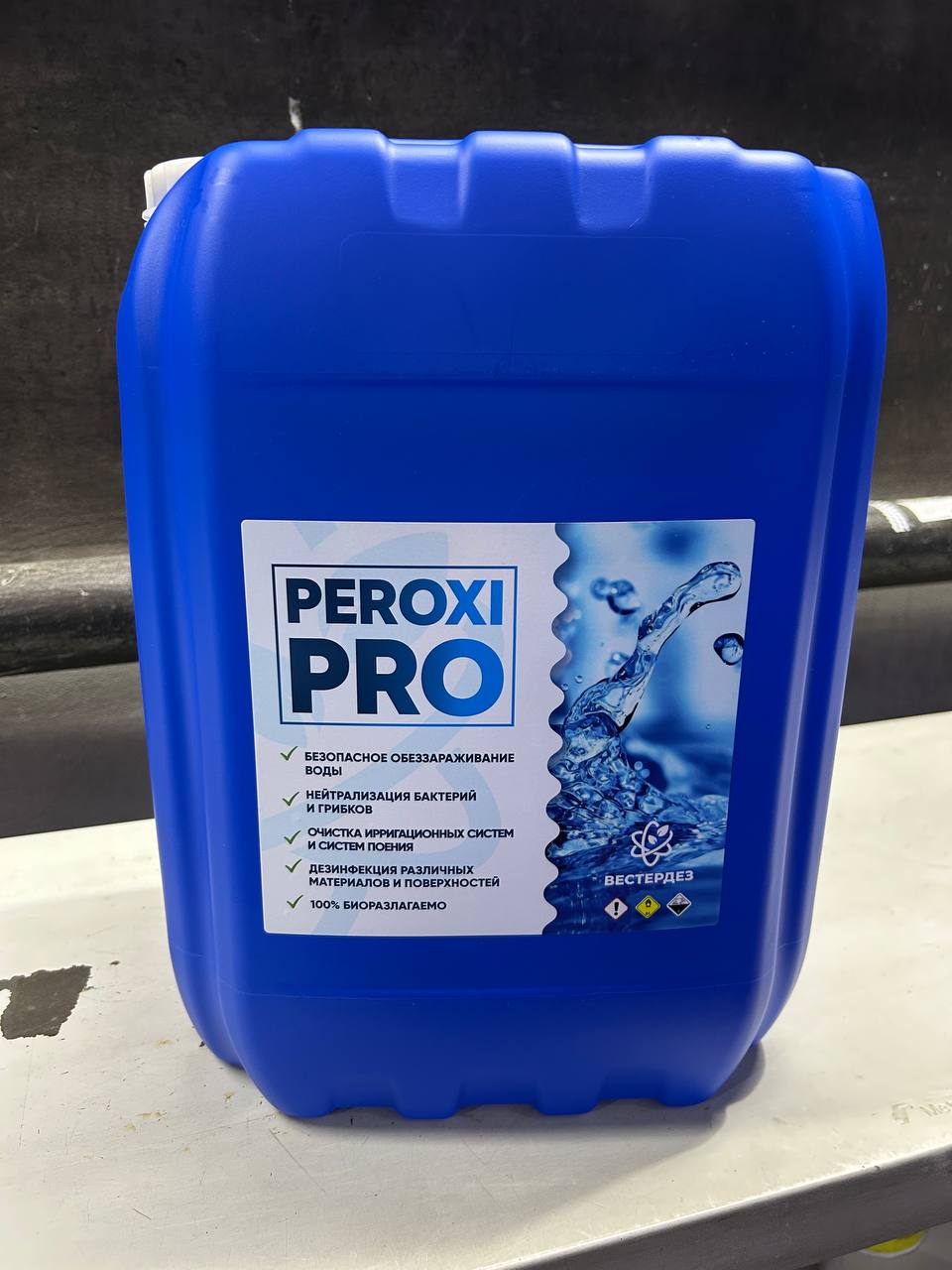 PeroxiPro от компании «ООО ВЕСТЕРДЕЗ» является дезинфицирующим средством на основе перекиси водорода. Оно предназначено для очистки и дезинфекции воды, ирригационных систем и систем поения. PeroxiPro удаляет органические загрязнения и предотвращает формирование минеральных отложений в накопительных емкостях, трубах, ниппелях и форсунках, а также подходит для (профилактической) дезинфекции различных видов поверхностей, материалов и оборудования на предприятиях тепличной и мясной промышленности.
